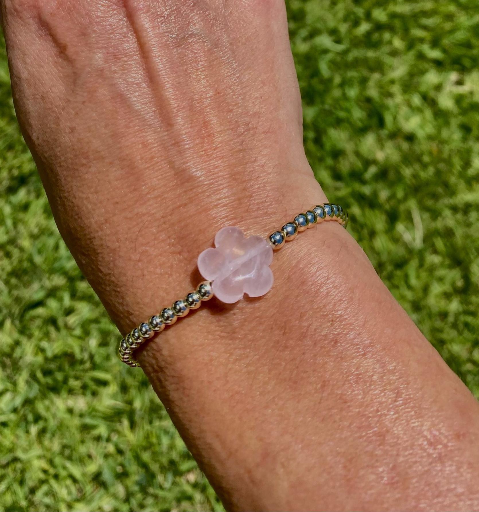 14K Gold Filled Beaded Bracelet. 4mm Non Tarnish Gold filled beads with 15mm center Light Pink, Rose Quartz Charm. Pretty Fall Minimalist Bracelet.