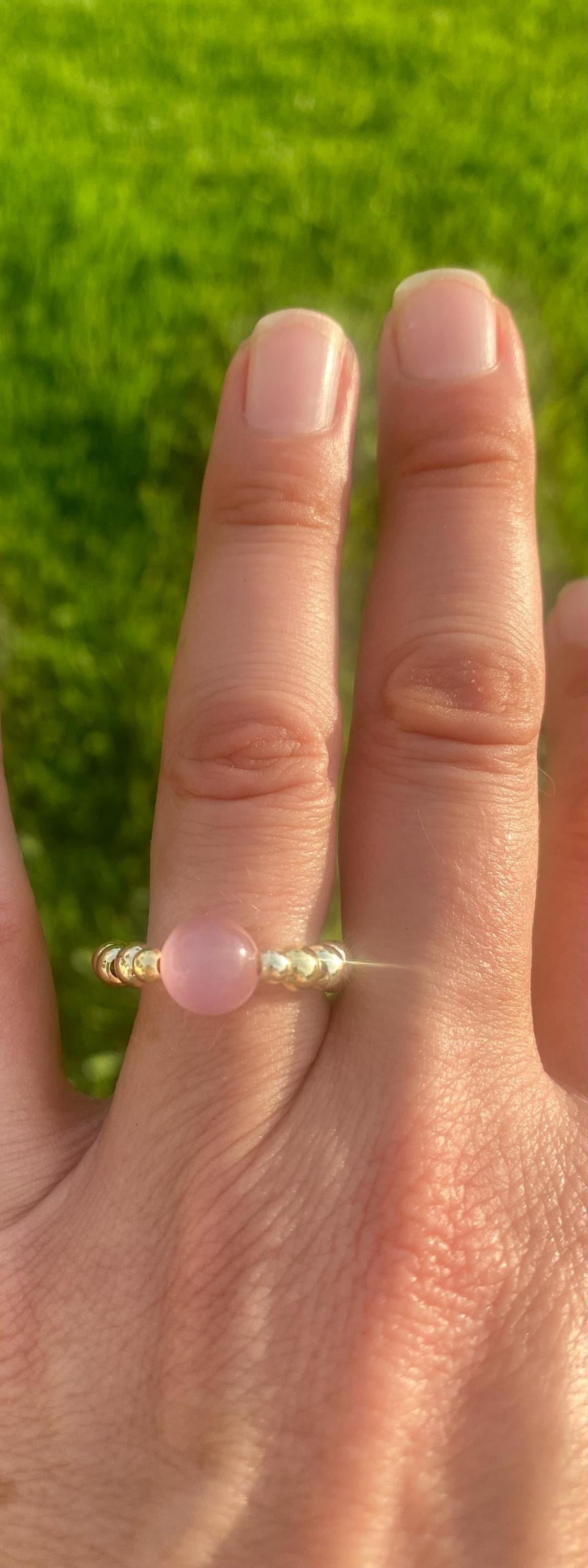 14k Gold Filled Gemstone Beaded Rings. 4 mm Gold Beads with Center Statement Stone. Blue Cat's Eye, Green Cat's Eye, Rose Quartz, Yellow Citrine. Non tarnish 4mm and 5mm 14k Gold filled Beads. Non- tarnish made on high quality elastic.