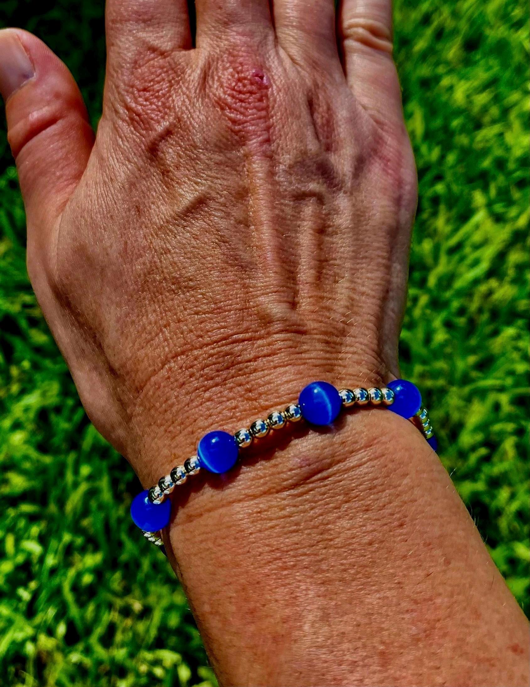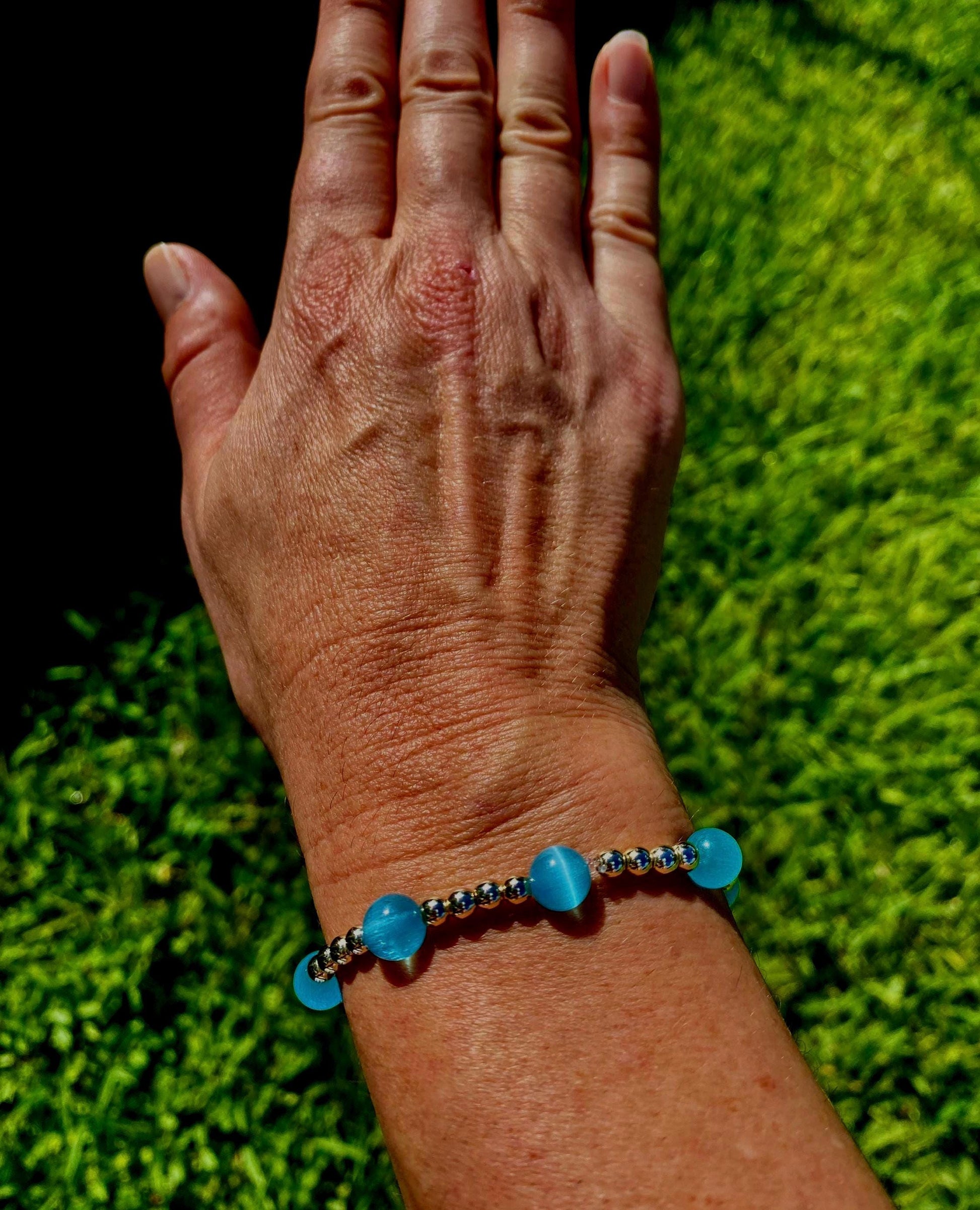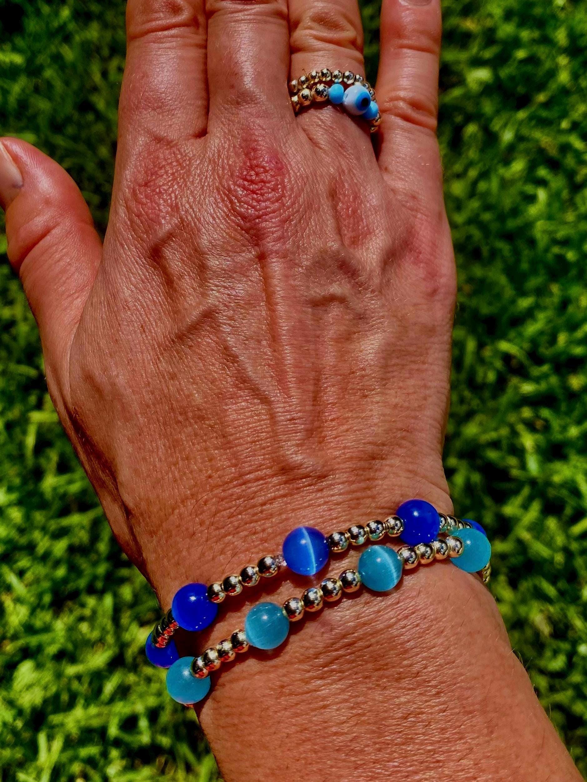 14K Gold Beaded Bracelet. 4mm Gold Filled Beads. Teal Blue or Sky Blue Cat's Eye 8mm Spacer Gemstone Beads.