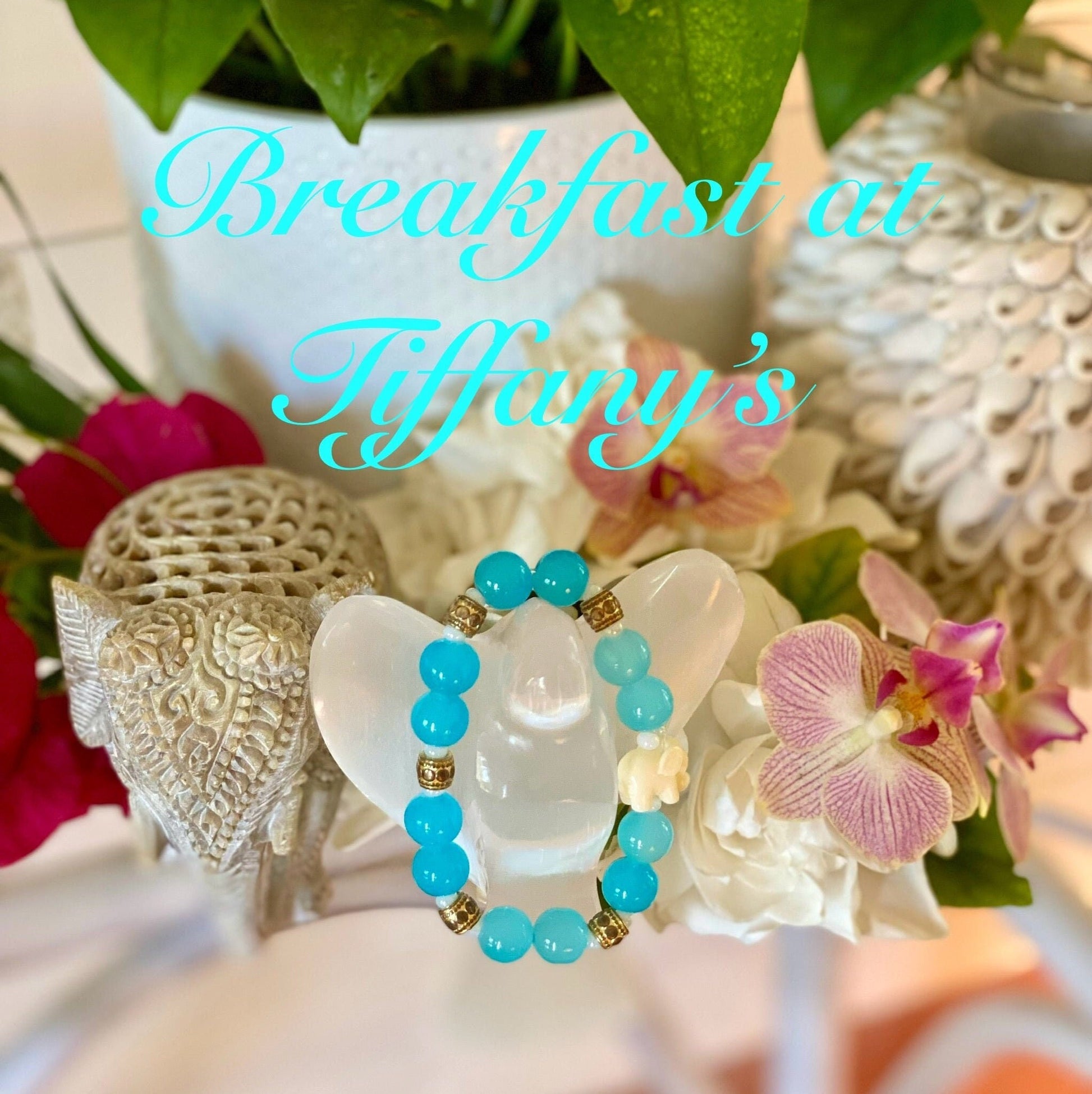 Breakfast at Tiffany. Aquamarine Blue 8 MM Glass Beads White Resin Elephant Charm with Gold Lava Rock Accent Pieces.