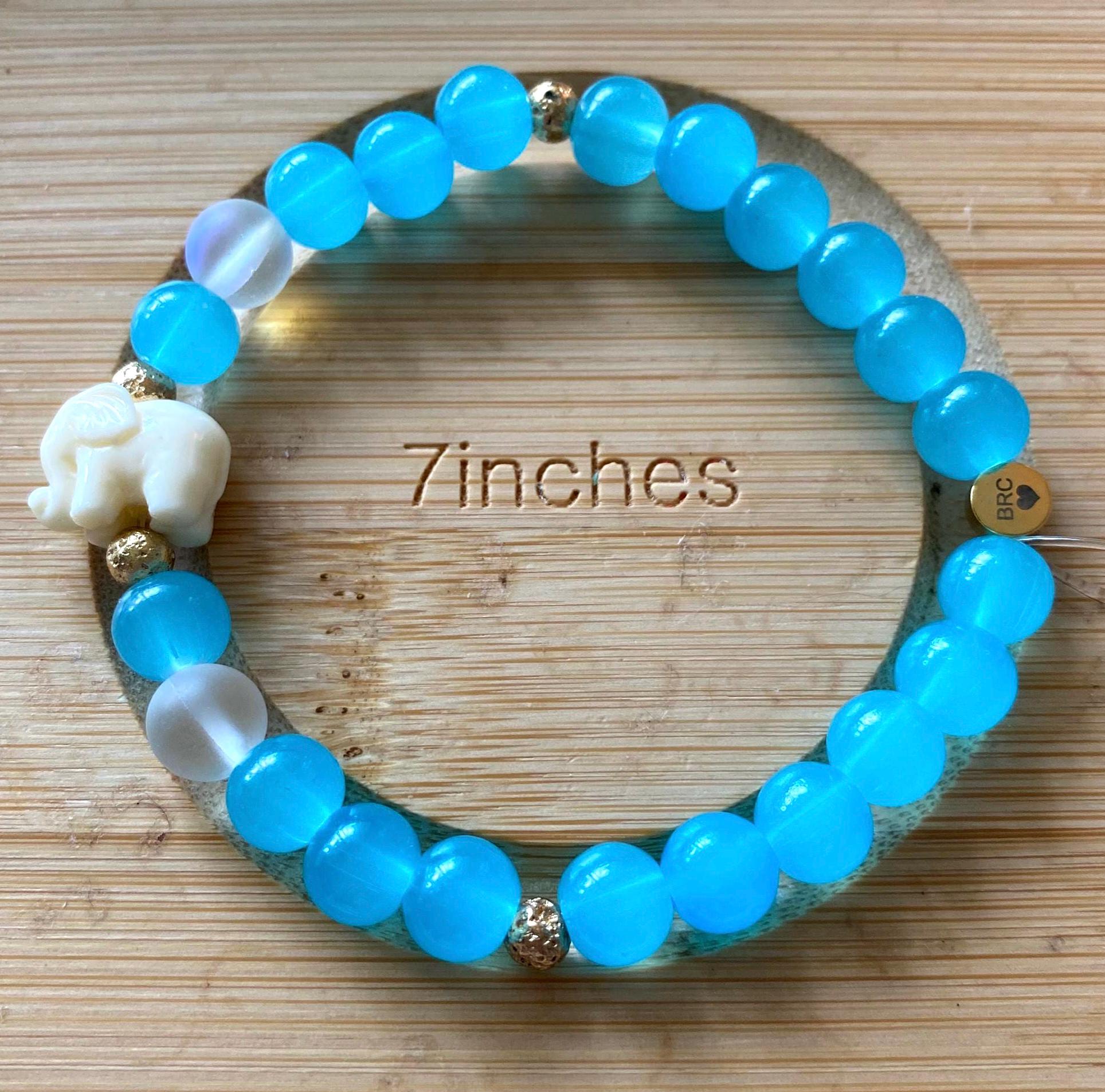 Aquamarine Glass Beaded Bracelet: White Resin Elephant Charm, 14k Gold Accents.