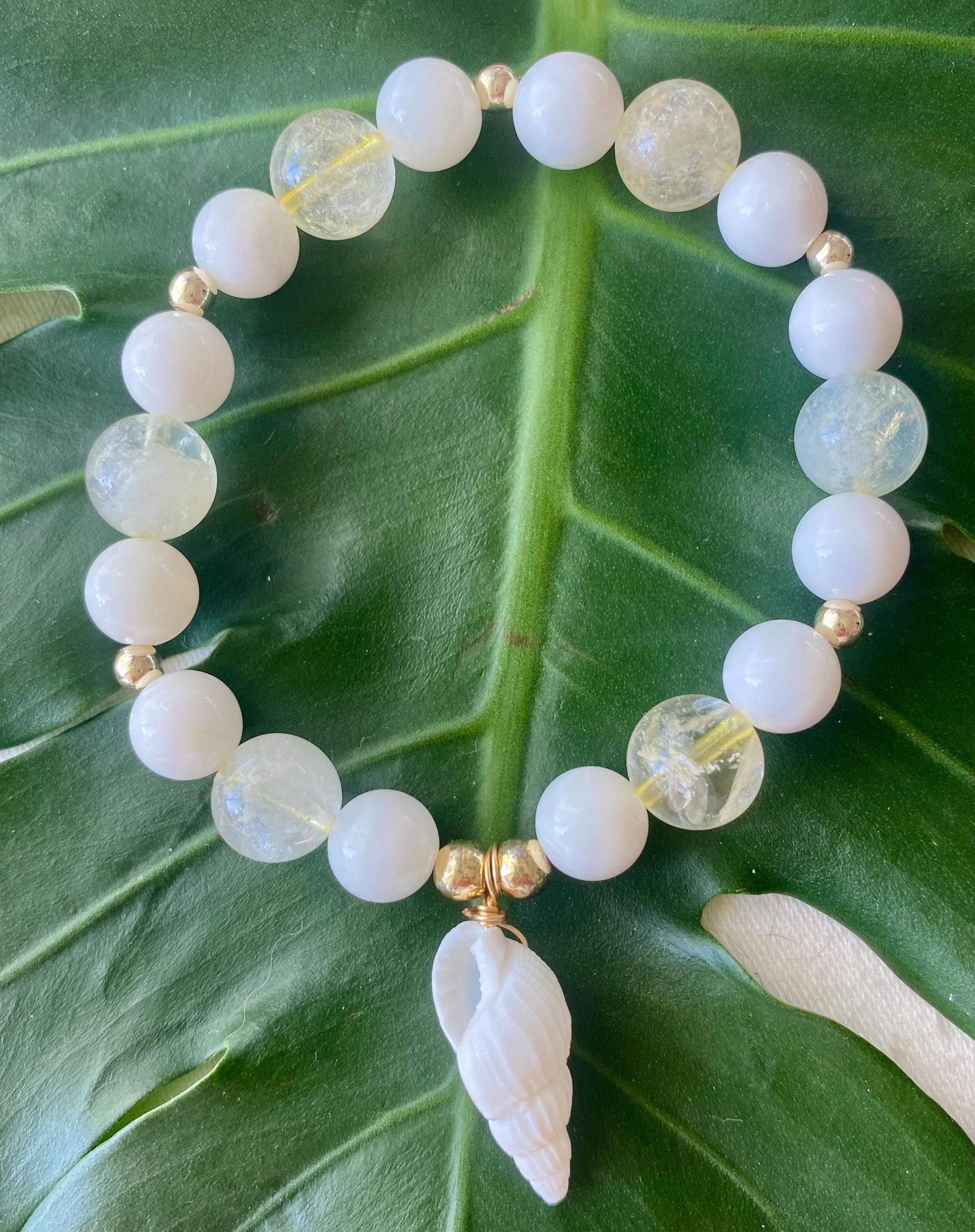 Citrine Gemstone & White Shell Charm Beaded Bracelet. 8mm White Shell and 10mm clear yellow Citrine Beads and 14k Gold filled Accent Beads.