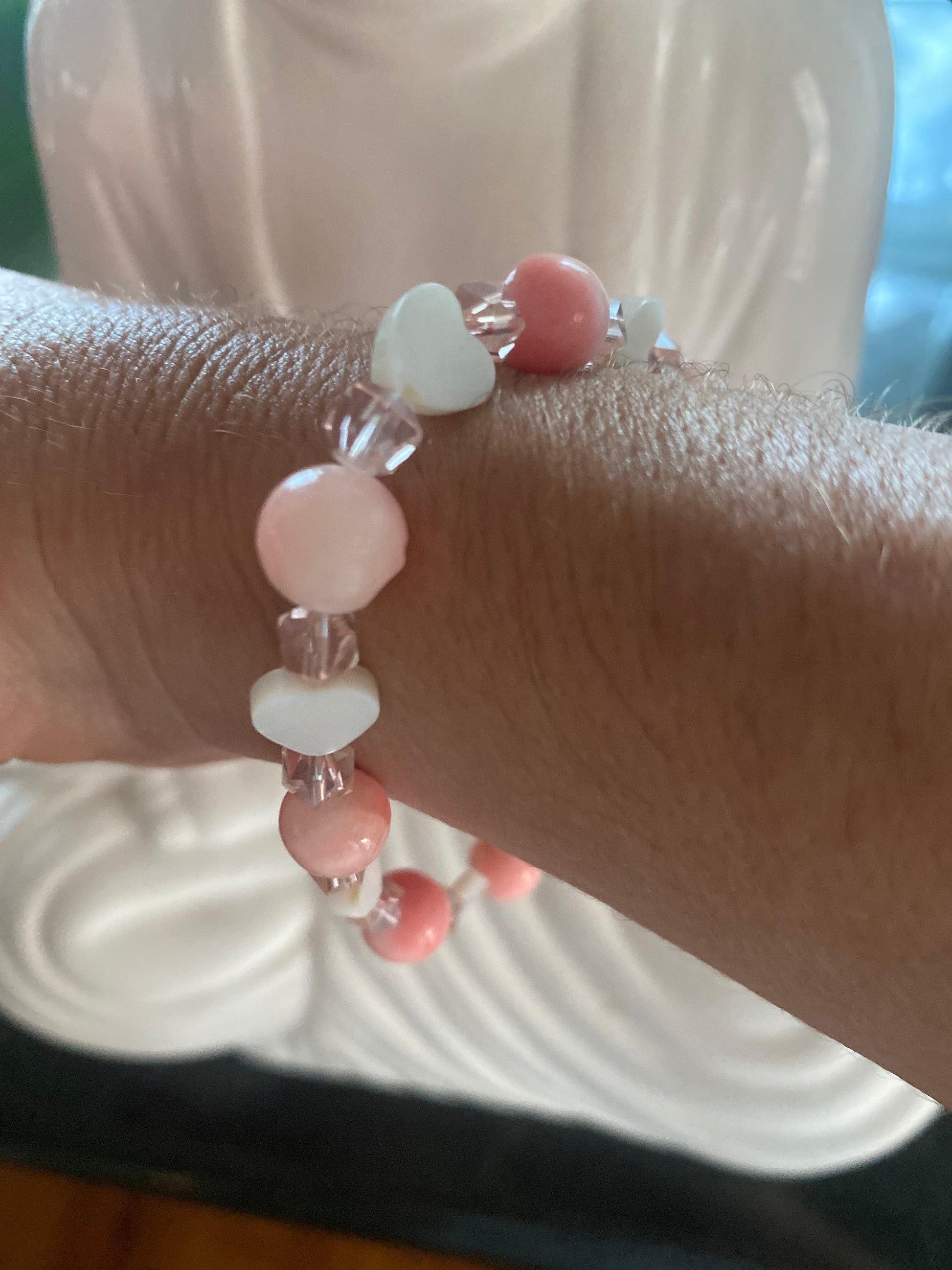 Pink Coral Beaded Bracelet: Glass Beads & River Shell Hearts.