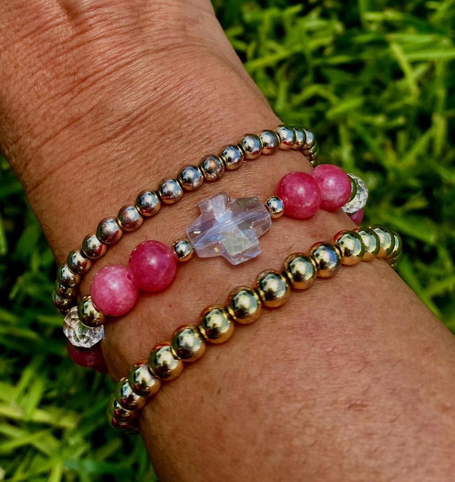 Fall Pink Raspberry Jade 8mm Gemstones, 20mm Glass Cross and 14k Gold Filled (Non tarnish) Accent Beads. This Bracelet comes in Multiple Sizes. Perfect to wear alone or Stack with your favorite Bracelet's. We believe presentation is everything. All of our bracelets come in boxes with coordinating tissue and bows. Handmade in Naples, Florida, USA.