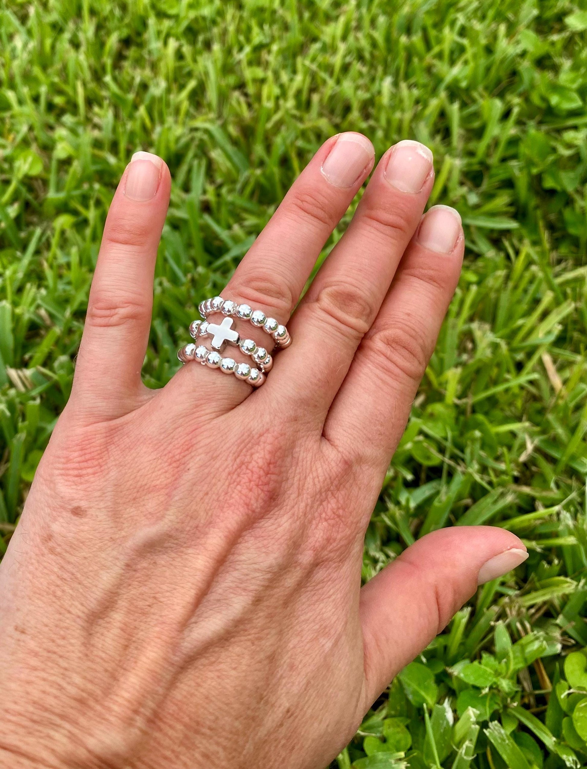 Silver Plated Cross Stacking Ring. Simple & Dainty. The ring sizes come in 3mm, 4mm & 5mm Bead size. Non tarnish made on high quality elastic.