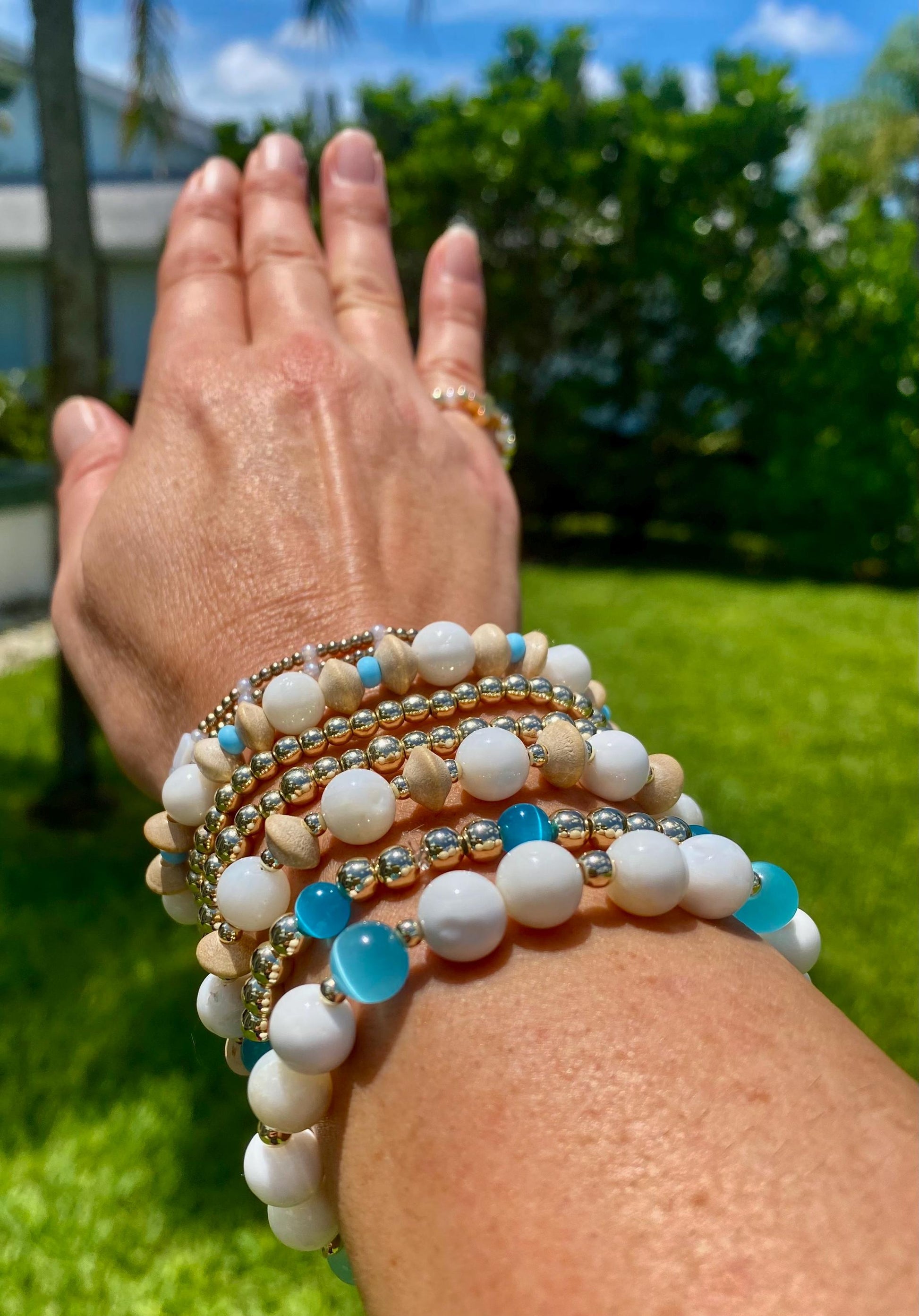 White Shell Beaded Stacking Bracelets. Made with 8mm White Natural Shell Round Beads, Natural Wooden Disc Beads with Blue Glass Accent Beads. Can be sold together as a set of 3 or individually.